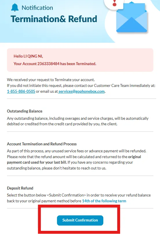 サービスの解約が完全完了した後、PhoneBoxから左のメールが送られます。” Submit Confirmation” をクリックすることで、PhoneBoxからクリックした翌月末に登録クレジットカードへ返金がされます。