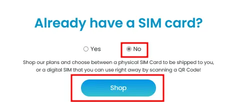 “Do you have a SIM card?” 질문에 <No>를 선택하시고 <Shop>로 넘어가주세요